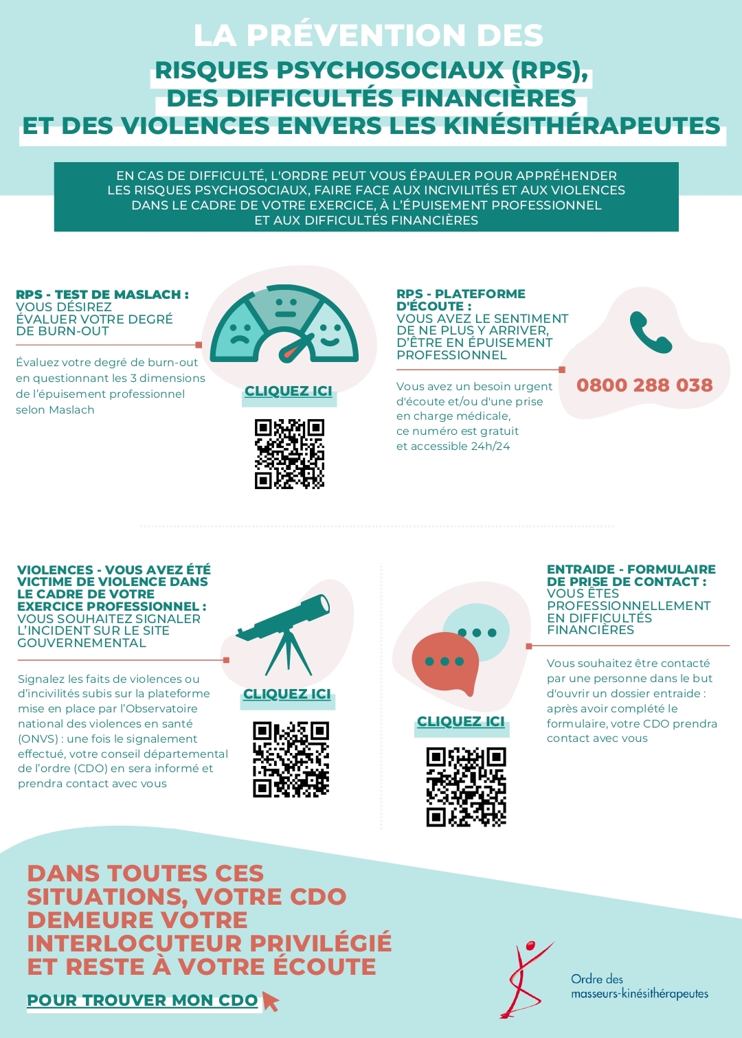 Infographie – Prévention des risques psychosociaux, difficultés financières, violences envers les kinésithérapeutes : à qui s’adresser dans ces situations ?